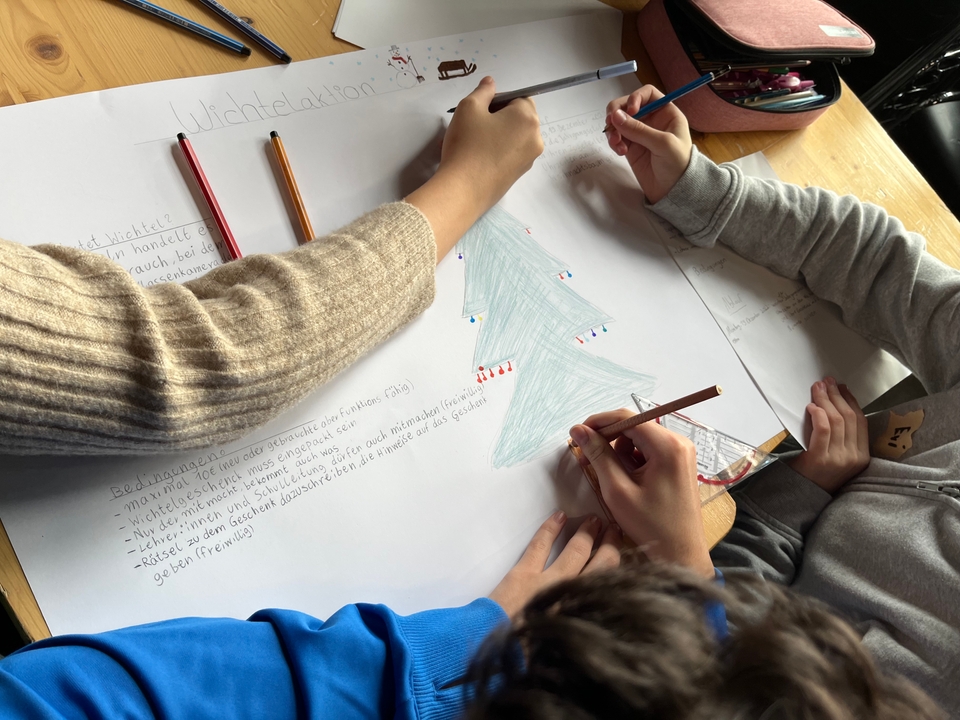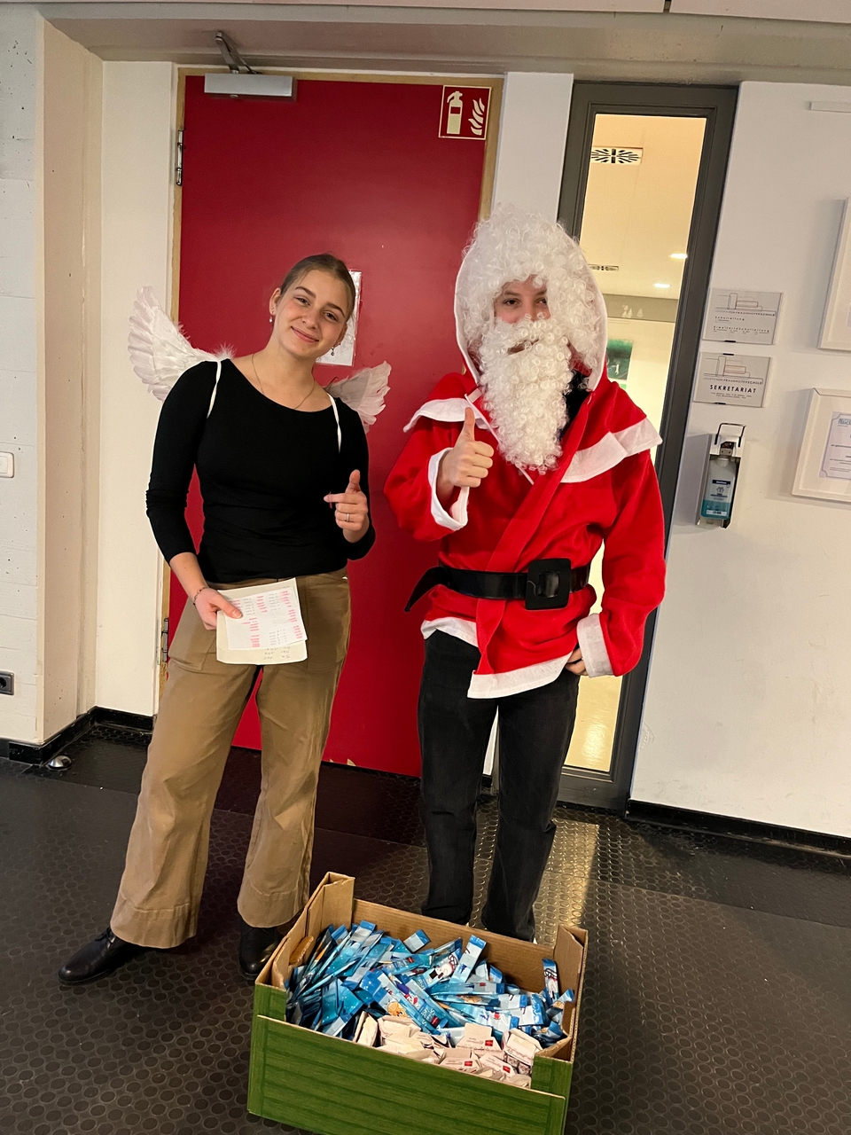 Ein paar Wochen später stand der Nikolaustag vor der Tür, für den wir uns trotz Krankheit eingesetzt haben. Die Idee war es, den 5. und 6. Klassen Schokolade auszuteilen. Und da wegen Corona die Nikolausaktion für die diesjährigen 7. Klassen in den letzten Schuljahren ausgefallen war, haben wir denen ebenfalls Schokolade gebracht. Verkleidet als Nikolaus und Engel sind wir durch die Klassen gegangen und haben zugesehen, wie sehr sich die Kinder über die Überraschung gefreut haben. Am Nikolaustag waren leider ein Schülersprecher krank, weshalb ein freiwilliger Schüler aus der Klasse unterstützte, sodass alle Sachen erfolgreich ausgeteilt werden konnten.