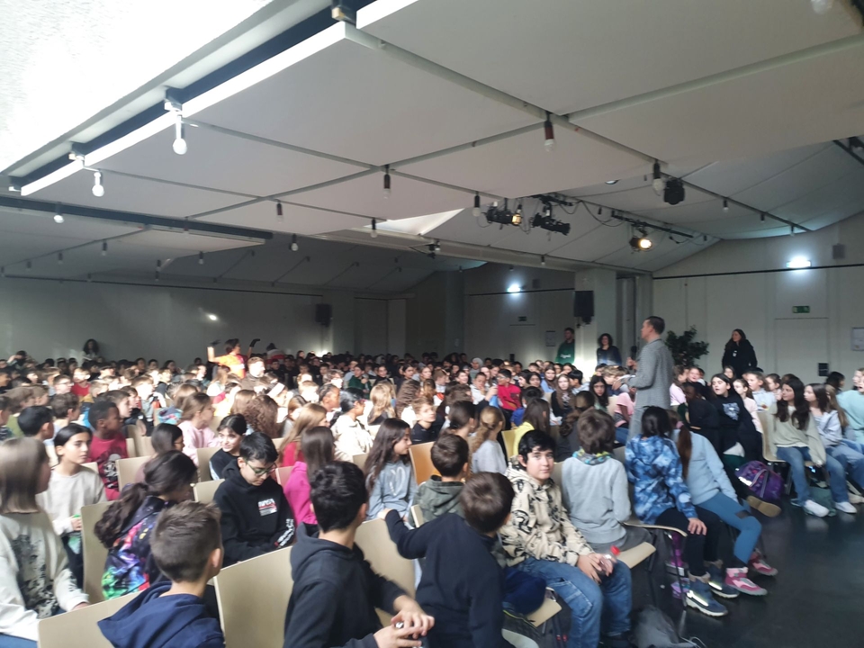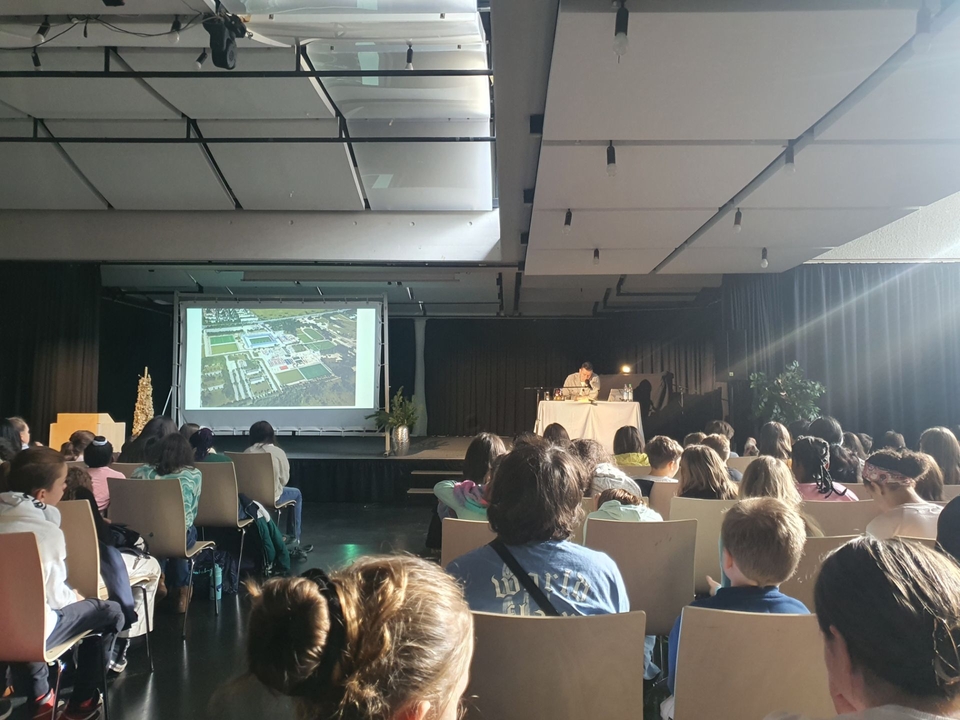 Die Veranstaltung fand in der Aula unserer Schule mit allen Schülerinnen und Schüler der 5. und 6. Klassen statt. Julien Wolff präsentierte nicht nur seine Werke, sondern erzählte auch von seinen Erfahrungen als Sportreporter und Journalist. Neben Einblicken in seine Arbeit bei großen Fußballturnieren in Qatar oder Brasilien beantwortete er gerne Fragen aus dem Publikum. Gerade das leidenschaftliche Thema Fußball brachte viele Fragen wie „Ronaldo oder Messi?“, „1960 oder Bayern?“ oder auch nach dem Geheimtipp unter den Nachwuchstalenten hervor.