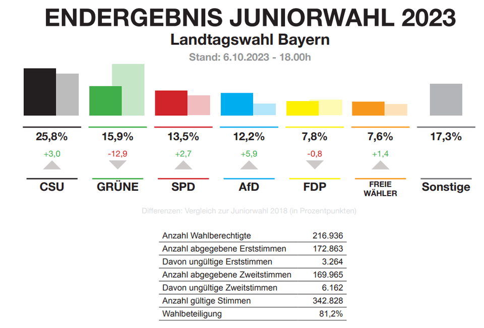 Die Juniorwahlen zur Landtagswahl in Bayern sind eine simulierte Wahl, die landesweit von vielen weiterführenden Schulen durchgeführt wird. Durch dieses handlungsorientierte Konzept zur politischen Bildung sollen die Heranwachsenden Demokratie erleben und erlernen. Ziel ist es, die jungen Menschen zur politischen Partizipation heranzuführen.