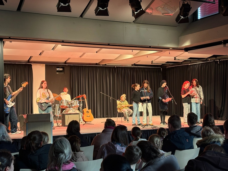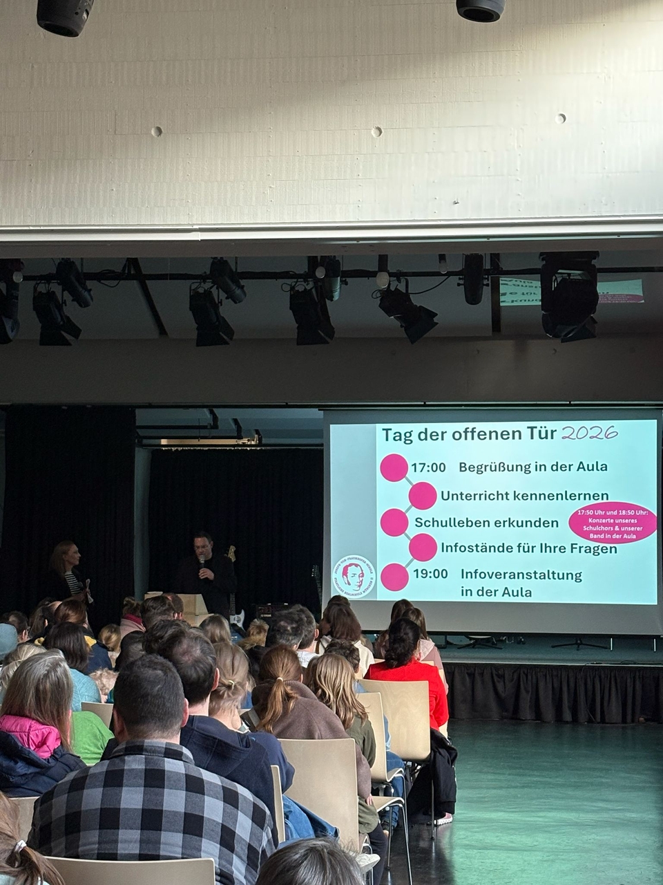 Den Auftakt bildete eine kurze, herzliche Begrüßung durch die Schulleitung, Herrn Drexl und Frau Mai, die um 17 Uhr in der Aula die Besucher willkommen hießen und einen Ausblick auf das vielfältige Programm gaben. Musikalisch untermalt wurde die Einführung vom Schulchor, der gemeinsam mit der Schulband performte.