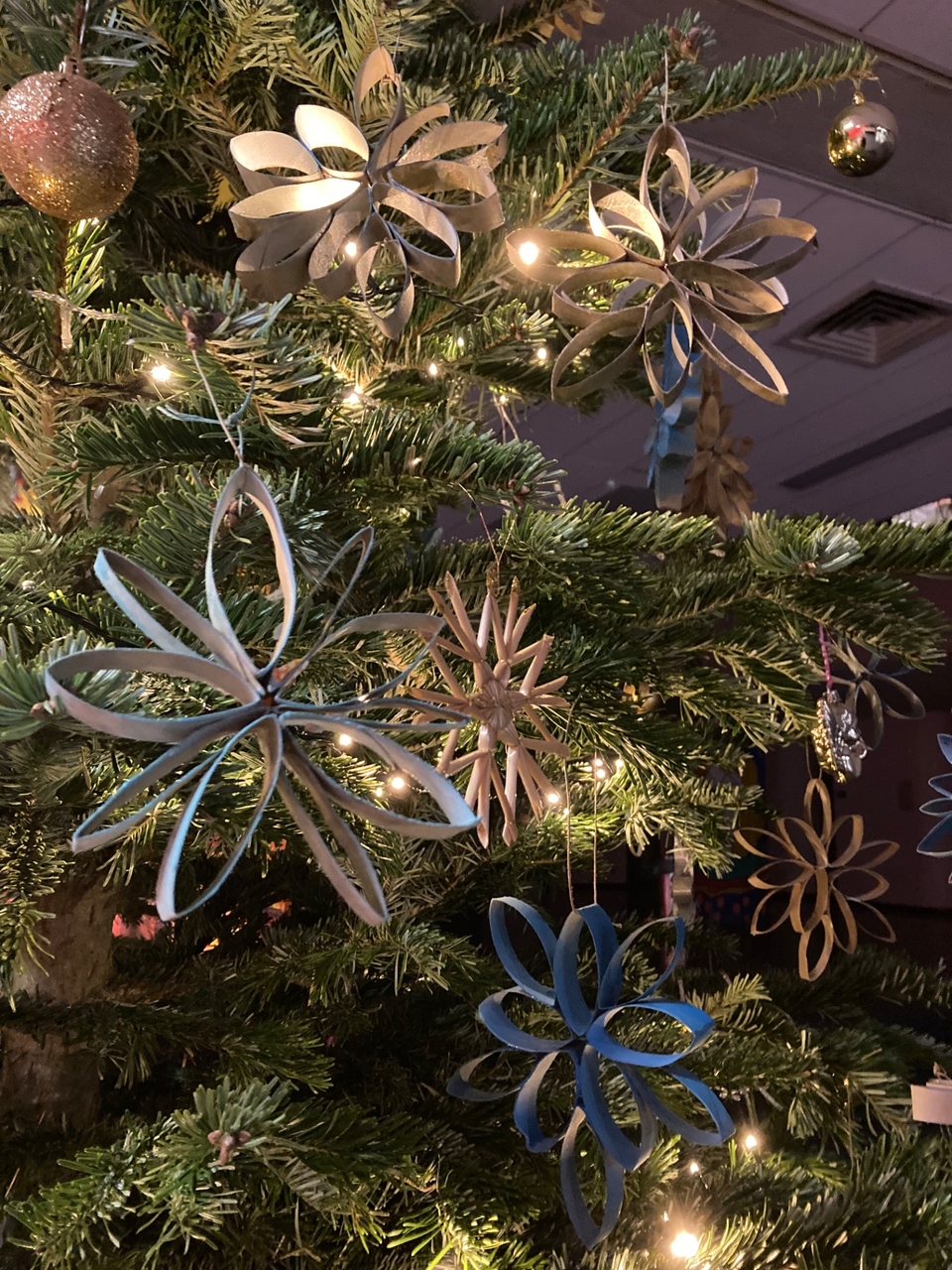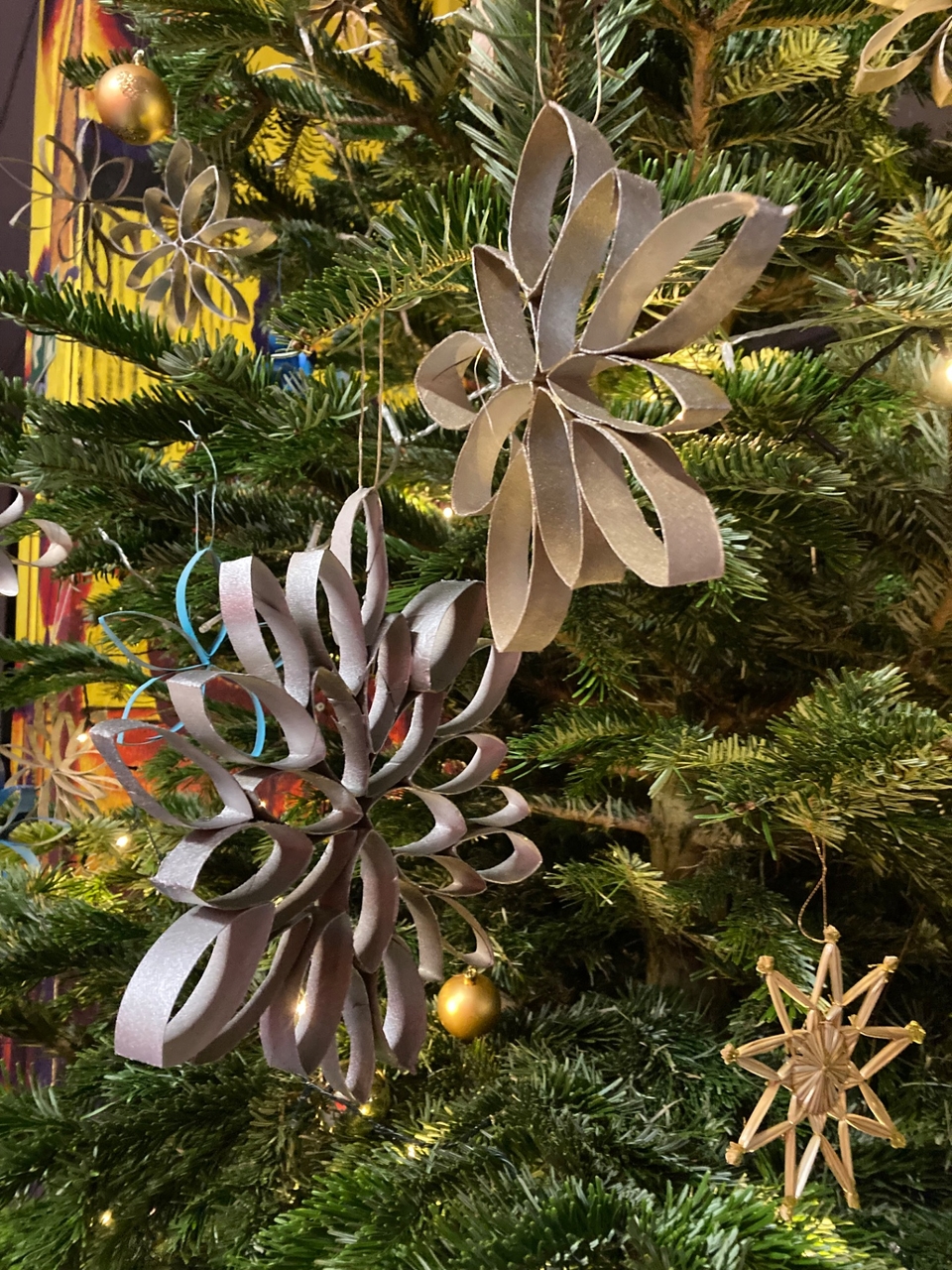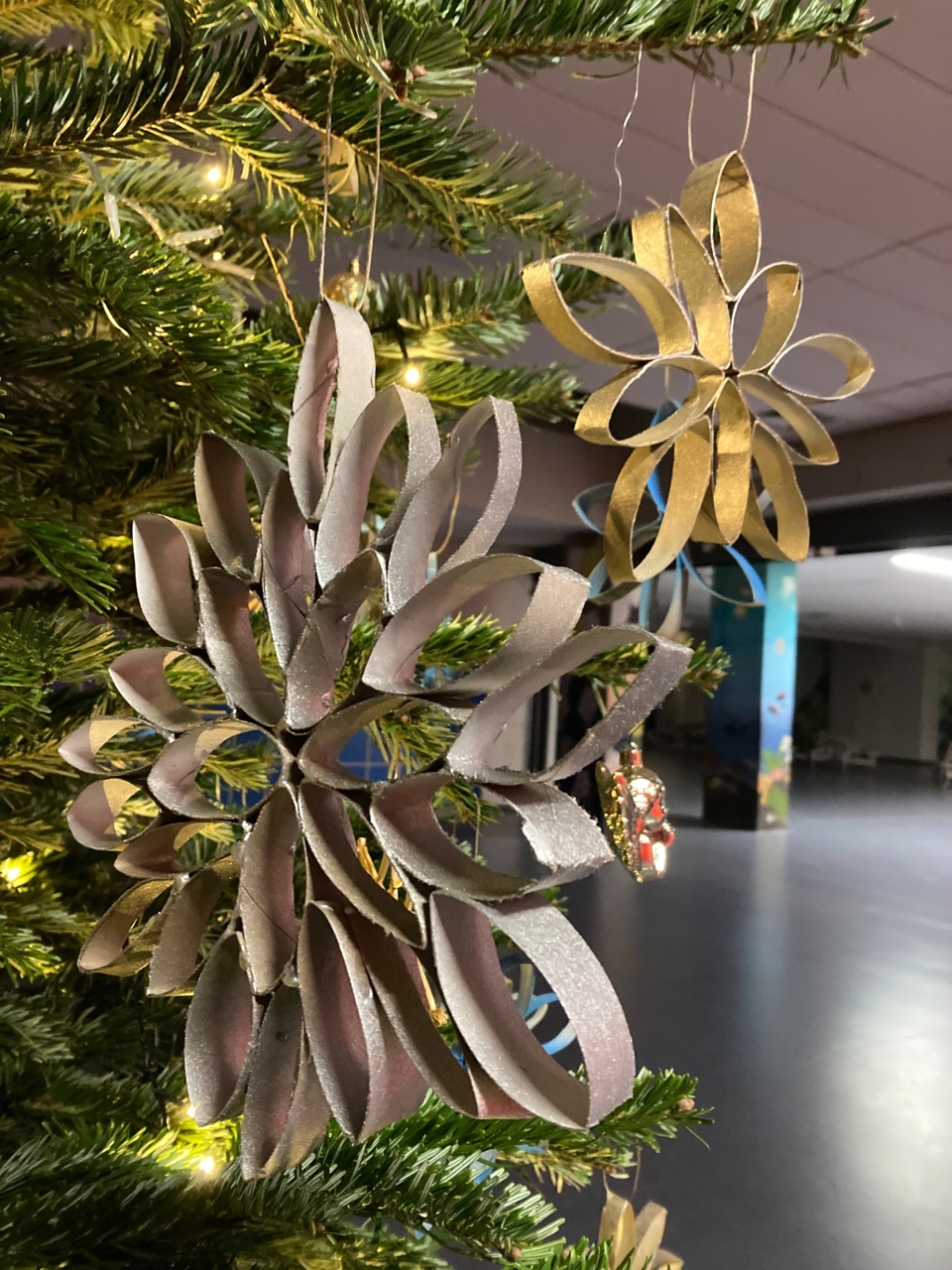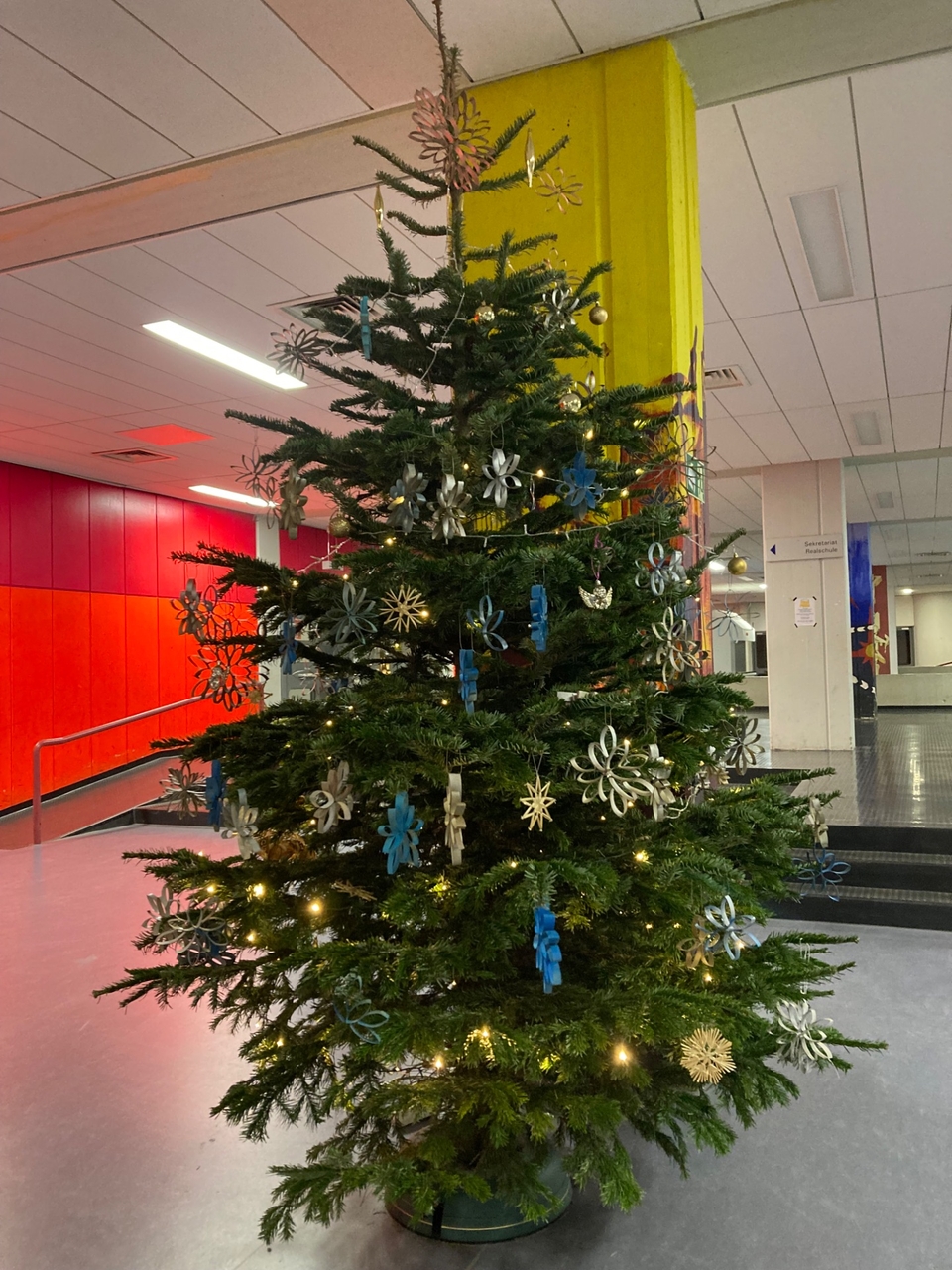 Der Christbaum der Joseph-von-Fraunhofer-Schule trägt in diesem Schuljahr ein besonderes Kleid. Die Schülerinnen und Schüler des Wahlfaches „Upcycling“ haben sich viel Mühe gegeben und den besonderen Schmuck nachhaltig gestaltet. Mit alten, leeren Papprollen lassen sie den Christbaum weihnachtlich strahlen.