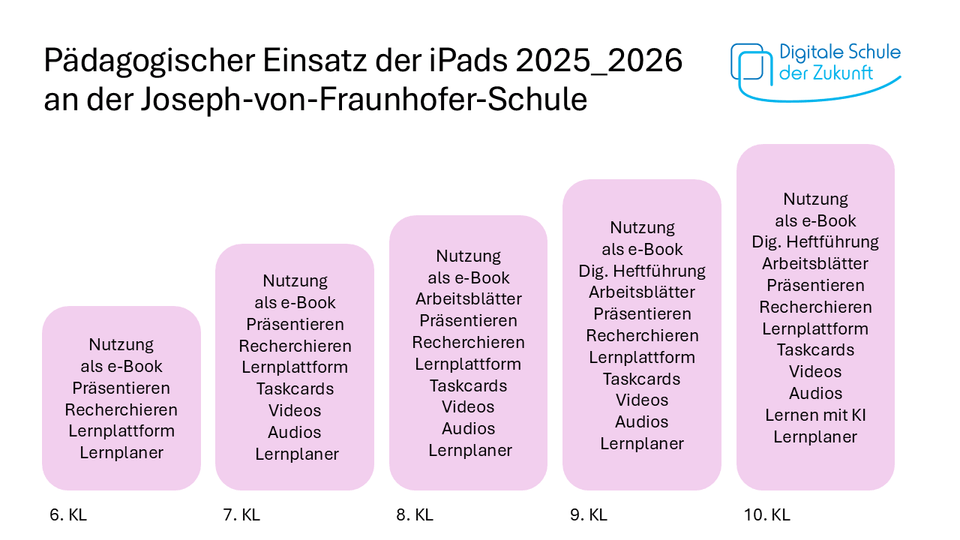 Ergänzend zu unserem bereits in vielen Teilen digitalen Unterricht, ermöglicht die Ausstattung der gesamten Klasse eine noch intensivere Auseinandersetzung mit digitalen Medien und die Steigerung der digitalen Kompetenzen. Deshalb ist vorgesehen, dass alle Schülerinnen und Schüler der Jahrgangsstufe ein eigenes Gerät besitzen.